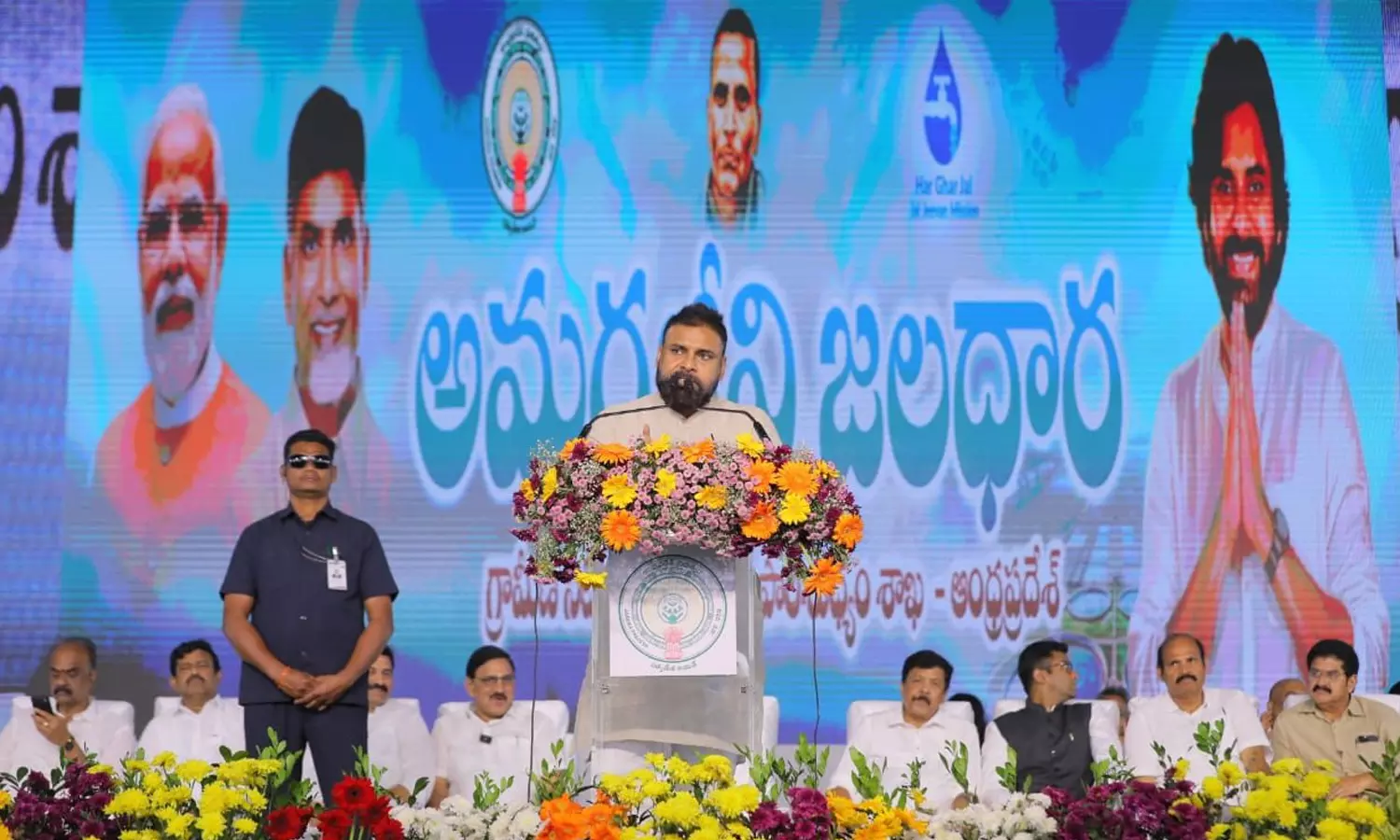 ‘‘తెలుగుజాతి ఆత్మగౌరవం కోసం అమరుడైన శ్రీ పొట్టి శ్రీరాములుని సదా స్మరించుకోవాలనే ఉద్దేశంతో వాటర్ గ్రిడ్ ప్రాజెక్టుకు “అమరజీవి జలధార”గా నామకరణం చేశాం. ఉమ్మడి ఉభయ గోదావరి జిల్లాల్లో భూగర్భ జలాలు కలుషితమైపోయాయి. స్వచ్ఛమైన తాగు నీరు కావాలంటే డబ్బు పోసి కొనుక్కోవాల్సిన దుస్థితి వచ్చింది. మళ్లీ మేము అధికారంలోకి వస్తాం. మీ అంతు చూస్తాం అని కొంతమంది వైసీపీ నాయకులు బహిరంగంగా బెదిరింపులకు దిగుతున్నారు. పనులు చేస్తే కాంట్రాక్టర్లను జైల్లో పెడతామని బెదిరిస్తున్నారు. వారందరికీ ఒకటే చెబుతున్నాం. మీకు యోగి ఆదిత్యనాథ్ ట్రీట్మెంటే కరెక్ట్. ప్రభుత్వం తలుచుకుంటే బలమైన నక్సలిజమే కకావికలం అయిపోయింది. ఇలా బెదిరింపులకు దిగే కిరాయి రౌడీలకు ప్రభుత్వం బలమైన పొలిటికల్ నిర్ణయం తీసుకుంటే మీ పరిస్థితి ఏంటో ఆలోచించుకోండి.’’ అని డిప్యూటీ సీఎం అన్నారు.