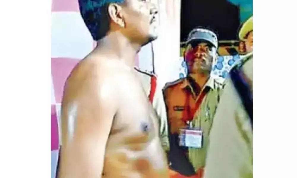 అయితే, తాను ఎటువంటి తప్పూ చేయలేదని చెబుతున్నా వినిపించుకోకుండా, ఎక్కువ మాట్లాడితే సస్పెండ్ చేయిస్తామంటూ పై అధికారులు మండిపడ్డారని సదరు పోలీసు అధికారి ఆవేదన వ్యక్తం చేశారు. అంతేకాక, తీవ్ర మనస్తాపంతో చొక్కా విప్పి నిరసన తెలిపారు. కాగా, ఈ ఘటనపై ఉన్నతాధికారులు స్పందిస్తూ అది నిరసన కాదని, అతడు ఫిట్స్ వచ్చి పడిపోతే ఆసుపత్రికి తీసుకెళ్లామని చెప్పడం గమనార్హం.