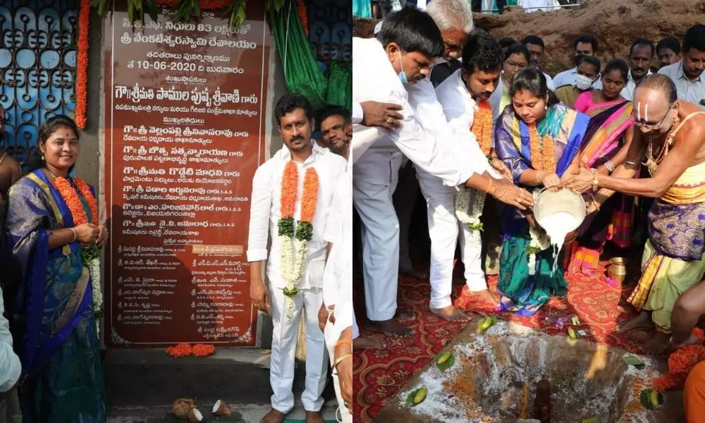 గరుగుబిల్లి: మండలంలోని తోటపల్లిలో వెలసిన శ్రీవేంకటేశ్వర, కోదండరామస్వామి దేవాలయ జీర్ణోద్ధరణ, అభివృద్ధి పనులకు బుధవారం డిప్యుటీ సిఎం పుష్ప శ్రీవాణి, వైసీపీ అరకు పార్లమెంటరీ అధ్యక్షులు శత్రచర్ల పరీక్షిత్ రాజు దంపతులు శంకుస్థాపన చేశారు. ఈ నేపథ్యంలోనే ఆలయంలో నిర్వహించిన ప్రత్యేక పూజా కార్యక్రమాల్లో ఉప ముఖ్యమంత్రి దంపతులు పాల్గొన్నారు. ఈ సందర్భంగానే పుష్ప శ్రీవాణి మాట్లాడుతూ, విజయనగరం జిల్లాలో ఎంతో ప్రసిద్ధి చెందిన తోటపల్లి ఆలయం తన సొంత నియోజకవర్గంలో ఉండటం అదృష్టమన్నారు.