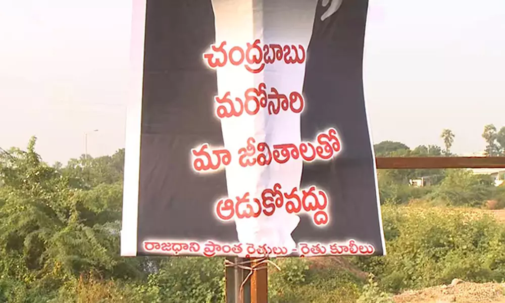 ఆంధ్రప్రదేశ్ ప్రతిపక్ష నాయకుడు చంద్రబాబు నాయుడు ఇవాళ రాజధాని అమరావతిలో పర్యటిస్తున్నారు. చంద్రబాబు పర్యటనకు టీడీపీ భారీ ఏర్పాట్లు చేసింది. అయితే చంద్రబాబు అమరావతికి రావొద్దంటూ కొందరు రైతులు భారీ ప్లెక్సీలను ఏర్పాటు చేశారు. చంద్రబాబు రాకను తీవ్రంగా వ్యతిరేకించిన రాజధాని రైతులు, నిర్మాణ కార్మికుల పేరిట ఈ ఫ్లెక్సీలను నిర్మించారు. కృష్ణానది నుండి రాయపుడి వరకు ప్లెక్సీలు ఏర్పాటు చేసిన రైతులు చంద్రబాబుకు ప్రశ్నలు సంధించారు. రాజధాని పేరిట రైతులను మోసం చేసిన చంద్రబాబు మళ్లీ అమరావతికి ఎలా వచ్చారని రాశారు.