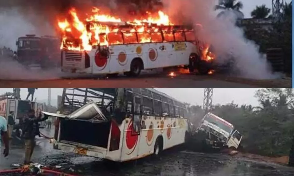 పూరి నుంచి రామేశ్వరం వెళ్తుండగా పైడిభీమవరం వద్ద ప్రమాదం జరిగింది. ఈ ఘటనలో 15 మంది స్వల్పంగా గాయపడ్డారు. వారిని శ్రీకాకుళం రిమ్స్ ఆసుపత్రికి తరలించి చికిత్స అందిస్తున్నారు. ప్రమాదంసమయంలో దట్టమైన పొగలు మంటలు వ్యాపించడంతో ప్రయాణికులు భయాందోళన చెందారు. ఘటన స్ధలానికి చేరుకున్న ఫైర్సిబ్బంది మంటలను అదుపులోకి తీసుకు వచ్చారు. దీంతో దాదాపు గంటకుపైగా ట్రాపిక్ నిలిచిపోయింది. ఎటువంటి ప్రాణం నష్టం జరగకపోవడంతో అంతా ఊపిరి పీల్చుకున్నారు.