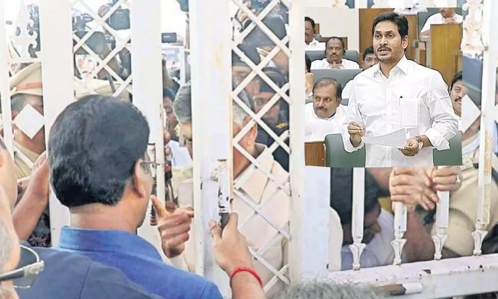 టీడీపీ అధ్యక్షుడు చంద్రబాబు నాయుడు తాను సభలోకి ప్రవేశించాల్సిన గేటు అసలు అది కాదని. ఆయన గేటు నెంబర్ 2 నుంచి సభలోకి రావాల్సి ఉందని. కానీ అందరితో కలిసి ఆందోళన చేయాలని చంద్రబాబు చూశారు. ప్రోటోకాల్ ప్రకారం సభ్యులను మాత్రమే లోనికి పంపేందుకు మార్షల్స్ ప్రయత్నించడం. చంద్రబాబు నోటి నుండి బాస్టర్డ్ అనే మాటొచ్చిందన్నారు. సభ్యులు కాని వారిని మార్షల్స్ అడ్డుకునే ప్రయత్నం చేశారని లోకేష్ మార్షల్స్ గొంతుపట్టుకొని యూస్లెస్ ఫెలో అన్నారని జగన్ చెప్పుకొచ్చారు.