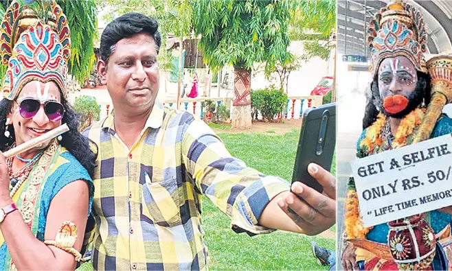అతని పేరు నూకాజీ, తన స్వస్థలం తుని. అతను ఎల్ ఎల్ బీ వరకు చదువున్నాడు. ఎంత చదుకున్నా అతనికి మాత్రం నాటకాల పైనే మోజెక్కువ. ఆ నాటకాలనే నమ్ముకున్న ఆయన బతుకు దెరువుకోసం హైదరాబాద్కు చేరుకున్నాడు. నాటకాలలో వేసుకున్న మాదిరిగానే రాముడిలా, హనుమంతునిలా చాలా వేషధారణలు వేసి నగరంలో తిరగడం మొదలు పెట్టాడు. అతని ఆలోచన అక్కడున్న వారందరినీ ఆకట్టుకుంది. దీంతో తనతో సెల్ఫీ దిగాలంటే రూ.50 చెల్లించాలంటూ మెడలో ఓ బోర్డును తగిలించుకున్నాడు. క్యాష్ మాత్రమే కాదు డిజిటల్ పేమెంట్స్ తీసుకునే ఫెసిలిటీ కూడా అతను ఏర్పరుచున్నాడు.