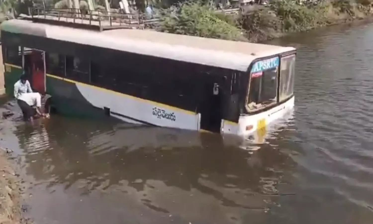 Bapatla: అదుపుతప్పి చెరువులోకి దూసుకెళ్లిన బస్సు