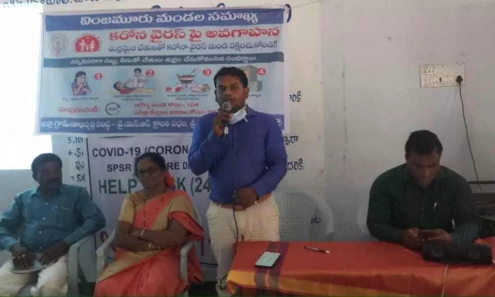 వింజమూరు:ప్రపంచ దేశాలను వణికిస్తున్న కరోనా వైరస్ పట్ల ముందు జాగ్రత్తలు పాటించి వైరస్ సంక్రమణ అరికడదామని చాకలకొండ ఎ. విద్యాధికారి డాక్టర్ సిహెచ్. హరికృష్ణ తెలిపారు.ప్రపంచ దేశాలను వణికిస్తున్న కరోనా వైరస్ పట్ల ముందు జాగ్రత్తలు పాటించి వైరస్ సంక్రమణ అరికడదామని చాకలకొండ ఎ. విద్యాధికారి డాక్టర్ సిహెచ్. హరికృష్ణ తెలిపారు. స్థానిక వైయస్సార్ క్రాంతి కార్యాలయంలో కరోనా వైరస్ నివారణ చర్యలపై అవాగాహన సదస్సును ఏర్పాట చేశారు. ఈ సందర్భంగా ఆయన మాట్లాడుతూ... కరోనా వైరస్ తో ప్రాణభయం వద్దని వైరస్ గాలిలో జీవించలేదన్నారు. కావున గాలి ద్వారా వ్యాపించదు కనుక ఆందోళన చెందాల్సిన అవసరం లేదన్నారు. లోహ వస్తువులపై లేదా తుమ్మినపుడు నోటిని, ముక్కును శుభ్రమైన చేతి రుమాలు కాని టిష్యూ పేపర్ కాని అడ్డం ఉంచుకోవాలన్నారు.