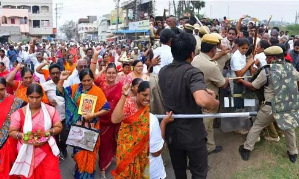 అమరావతి రాజధాని గ్రామాల్లో టెన్షన్ వాతావరణం నెలకొంది. తుళ్లూరు నుంచి విజయవాడ కనకదుర్గమ్మ ఆలయం వరకు మహిళలు చేపట్టిన పాదయాత్ర రణరంగంగా మారింది. పాదయాత్రకు అనుమతి లేదంటూ పోలీసులు అడ్డుకున్నారు. దీంతో మహిళలు, పోలీసులకు మధ్య వాగ్వాదం చోటు చేసుకుంది.