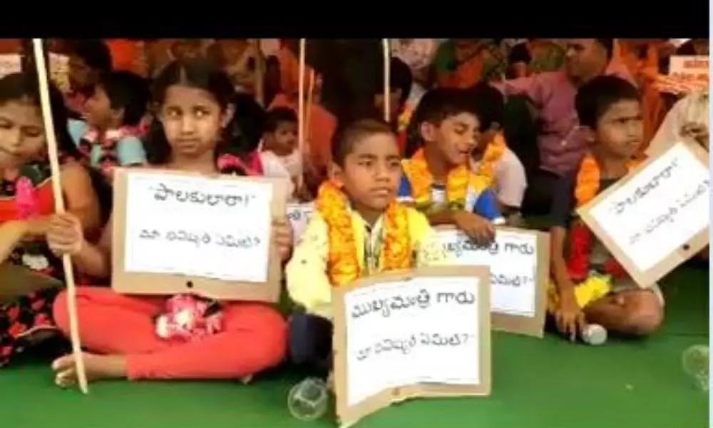 పాలకులారా మా భవిష్యత్ ఏంటి ? అంటూ అమరావతి రాజధాని రైతులు పిల్లలు ప్రశనిస్తున్నారు. తమ బంగారు భవిష్యత్ కోసం భూములు ఇస్తే రాజధాని తరలించి అన్యాయం చేస్తారా ? అంటూ నిరసలకు దిగారు. తుళ్లూరు దగ్గర నిర్వహిస్తున్న రైతుల దీక్షలో భూమిలిచ్చిన కుటుంబాల పిల్లలు కూడా నిరసనకు దిగారు. తమకు అన్యాయం చేయవద్దంటూ ప్లకార్డులు ప్రదర్శిస్తూ ప్రభుత్వ వ్యతిరేక నినాదాలు చేశారు.