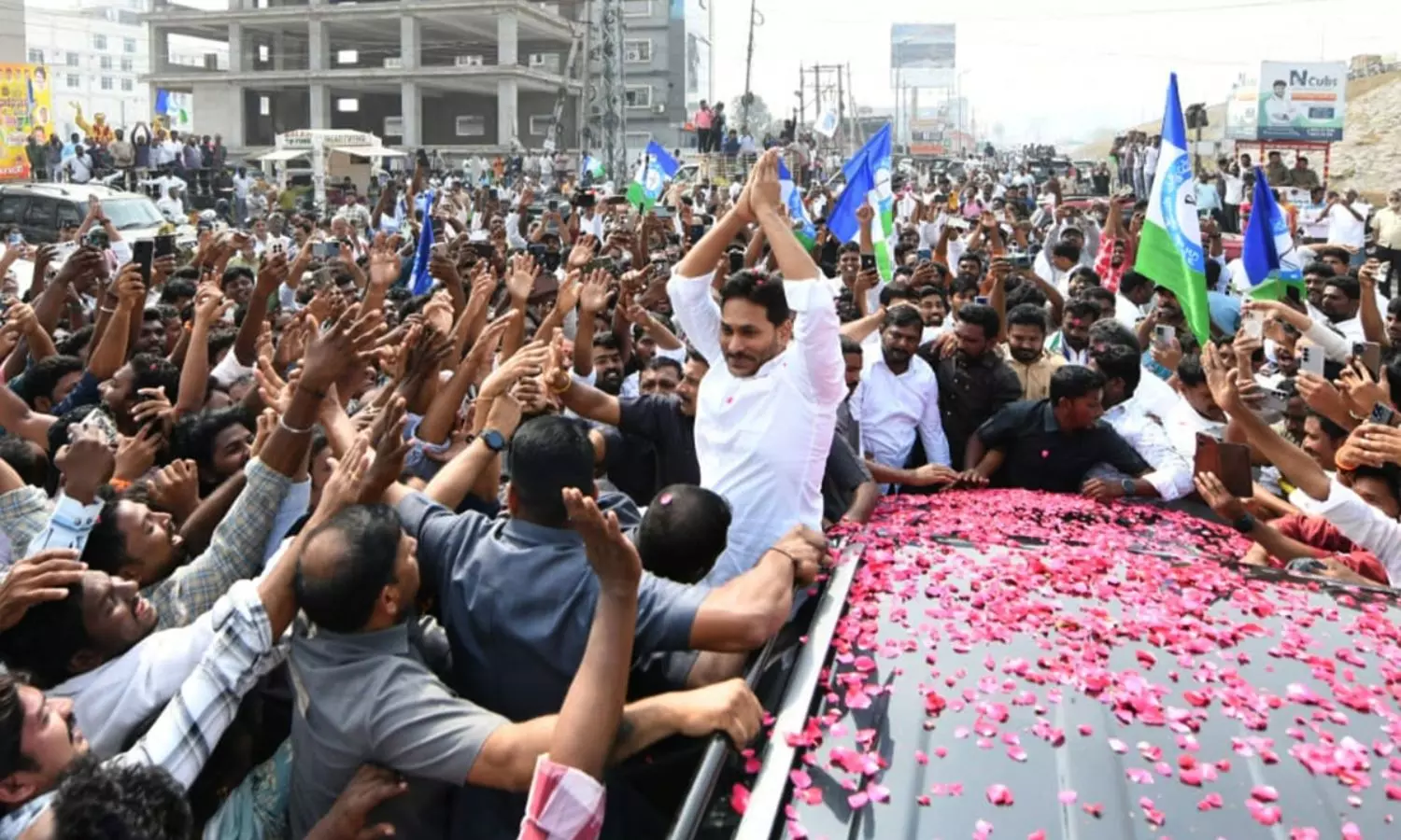 వైఎస్ జగన్ రాకతో గుంటూరు నగరంలోని ప్రధాన రహదారులు జనసంద్రంగా మారాయి. జగన్ కాన్వాయ్ వెంట భారీ సంఖ్యలో అభిమానులు, కార్యకర్తలు తరలివచ్చారు. ఆయన కారుపై పూల వర్షం కురిపిస్తూ, నినాదాలతో హోరెత్తించారు. భారీగా జనం తరలి రావడంతో జగన్ కాన్వాయ్ చాలా నెమ్మదిగా కదిలింది.