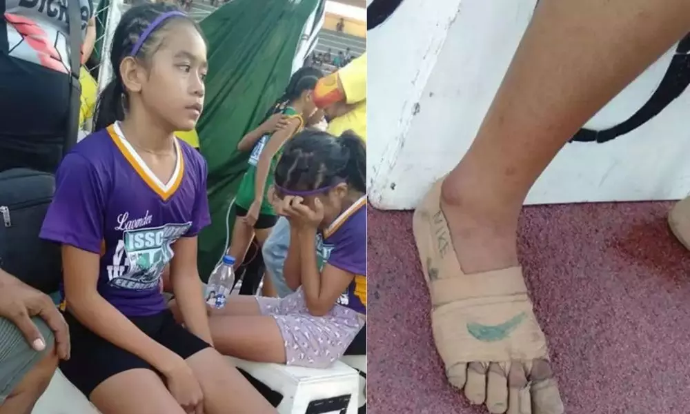 కనీసం వేసుకోవడానికి చెప్పులు కూడా లేని స్థితిలో కాళ్లకు టేపులు చుట్టుకుని పరుగులు తీసింది. అందరి కన్నావేగంగా పరుగులు తీసి విజయాన్ని సాధించింది. ఈ చిన్నారికి సంబంధించిన పూర్తి వివాల్లోకెళితే ఫిలిప్పీన్స్లోని బలాసన్కు చెందిన 11 ఏళ్ల చిన్నారి రియా బుల్లోస్. ఈ అమ్మాయి ఇటీవల ఇంటర్ స్కూల్ రన్నింగ్ పోటీల్లో పాల్గొని ఉత్సాహాన్ని కనబరిచింది. పోటీల్లో పరుగులు తీసేందుకు సిద్ధంగా ఉన్న ఆమె పాదాలు చూస్తే కనీసం ధరించడానికి షూ కూడా లేవు.