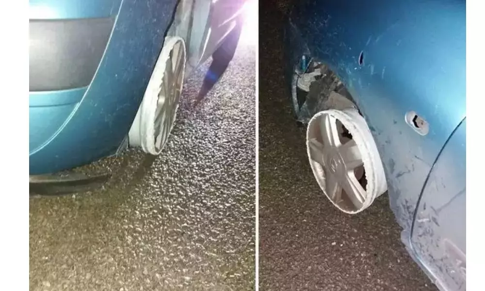 గ్రేటర్ మాంచెస్టర్ లో తాగుబోతు చేసిన హడావుడికి పోలీసులకు మతి పోయింది. మనోడు ఫుల్లుగా మందేసి.. ఆపైన కారెక్కి డ్రైవ్ చేసుకుంటూ రయ్యి..రయ్యిన రోడ్డుమీద వెళ్ళిపోతున్నాడు. రొటీన్ గానే పోలీసులు డ్రంక్ అండ్ డ్రైవ్ చెక్ లు చేస్తున్నారు. వారు ఈ మందుబాబును ఆపారు. కారు దింపారు. మనోడికి సోయి ఉంటేగా.. ఇక కారును పరిశీలించిన పోలీసులకు ఒక్కసారిగా షాక్ తగిలింది. ఇంతకీ ఏమైందంటే, ఆ కారుకు ముందు వైపు ఉండాల్సిన రెండు టైర్లూ లేవు. కేవలం డిస్క్ లు మాత్రమే ఉన్నాయి. మన మందుబాబుకి ఆ విషయం కూడా తెలీలేదు అంటే, ఎంతగా కిక్కులో ఉన్నడో చూడండి.