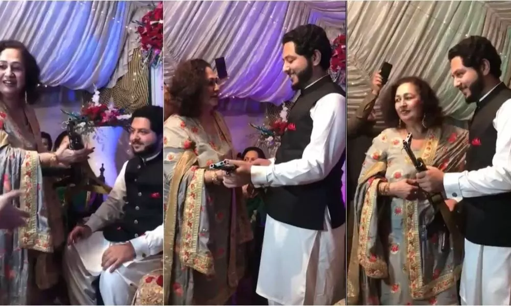 సాధారణంగా పెళ్లికి వెళ్తే ఎలాంటి గిఫ్ట్ తీసుకెళ్తారు.. ఏ గోడ గడియారమో, మరీ డబ్బులు ఎక్కువ పెట్టాలి అనుకుంటే జ్యువలరీనో ఇస్తారు. వెరైటీ బహుమతులు కూడా కొందరు ఇస్తారనుకోండి! అలాంటిది ఓ గన్ గిఫ్ట్గా ఇస్తే ! అదేంటి అనుకుంటున్నారా అదే జరిగింది మరి ! ఈ వీడియో ఇప్పుడు సోషల్ మీడియాలో తెగ వైరల్ అవుతోంది. పెళ్లిలో ఓ మహిళ వరుడికి ఏకే 47 రైఫిల్ని బహుమతిగా ఇచ్చింది. ఇదే ఆశ్చర్యం అంటే ఆ గిఫ్ట్ ఇచ్చినప్పుడు అక్కడున్న వాళ్ల క్లాప్స్ కొట్టడం మరీ వింతగా అనిపించింది. పాకిస్తాన్లో ఈ ఘటన జరిగినట్లుగా తెలుస్తోంది. గిఫ్ట్ తీసుకుంటే తీసుకున్నావ్ టెస్ట్ చేయాలని అనుకోకు అంటూ నెటిజన్లు సెటైర్ల మీద సెటైర్లు వేస్తున్నారు.