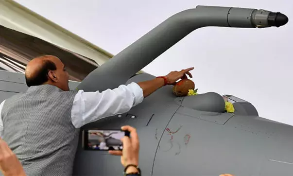 విజయదశమి సందర్భంగా ఫ్రాన్స్లో రాఫెల్ యుద్ధ విమానానికి కేంద్ర రక్షణ మంత్రి రాజ్ నాథ్ సింగ్ పూజలు చేయడం ఇప్పుడు సోషల్ మీడియాలో చర్చనీయాశంమైంది. భారత వైమానిక దళం తరఫున దీర్ఘకాలంగా ఎదురుచూస్తున్న 36 రాఫెల్ యుద్ధ విమానాలలో మొదటిదాన్ని స్వీకరించేందుకు రక్షణశాఖమంత్రి రాజ్ నాథ్ సింగ్ ఫ్రాన్స్ వెళ్లిన విషయం తెలిసిందే. మూడు రోజుల ఫ్రాన్స్ పర్యటనలో ఉన్న రాజ్నాథ్ సింగ్ రాఫెల్ తయారీదారు డసాల్ట్ ఏవియేషన్ ఫెసిలిటీ దగ్గర రాఫెల్ అప్పగించడాన్ని అంగీకరించారు. అధికారికంగా భారత్కు అందిన రాఫెల్ యుద్ధ విమానానికి దసరా సందర్భంగా ఆయుధపూజ నిర్వహించారు రాజ్ నాథ్.