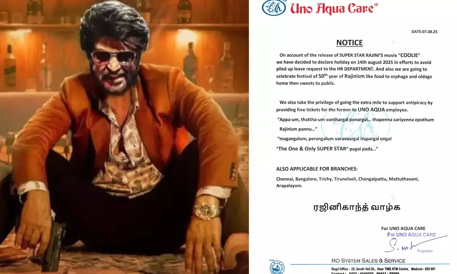చెన్నైతో పాటు బెంగళూరు, తిరుచ్చి, తిరునెల్వేలి, చెంగల్పట్టు, మట్టుతావని, అలపాలయం వంటి బ్రాంచిల్లోని ఉద్యోగులకు ఈ అవకాశం లభిస్తోంది. యూఎన్ఓ అక్వా అనే సంస్థ ఆగస్టు 14న తమ ఉద్యోగులకు సెలవు ప్రకటించింది. అంతేకాదు, ఆ రోజు వారికి ‘కూలీ’ సినిమా ఫ్రీ టిక్కెట్లు అందజేస్తూ, వృద్ధాశ్రమాలు, అనాథ శరణాలయాల్లో స్వీట్లు పంచే కార్యక్రమాన్ని కూడా నిర్వహిస్తోంది. ఈ ప్రకటనతో ఉద్యోగుల్లో భారీ ఉత్సాహం పెరిగింది.
