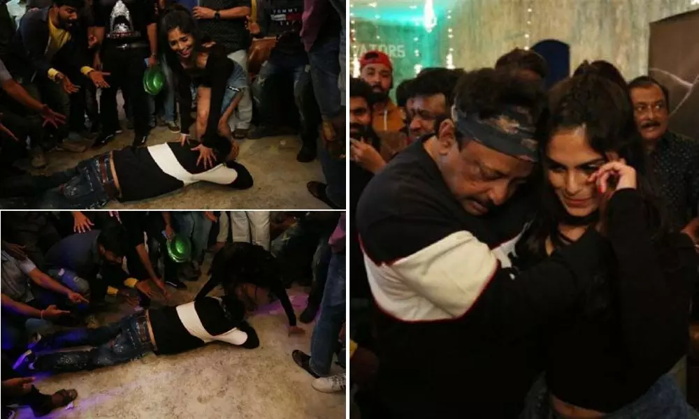 అయితే ఇందులో భాగంగా బ్యూటిఫుల్ నటీనటులతో కలిసి ఆర్జీవీ డ్యాన్సులు వేశారు. దీంతో అక్కడ ఉన్న అభిమానులు ఈలలు వేసి తమ ఆనందాన్ని వ్యక్తం చేశారు. అనంతరం ఈ సినిమాలో ఓ పాటకు హీరోయిన్ నైనాతో కలిసి ఆర్జీవీ డ్యాన్స్ చేశారు. డ్యాన్స్లో భాగంగా ఆయన హీరోయిన్ నైనా కాళ్లపై పడ్డారు. ఆర్జీవీ చేసిన పనికి షాక్కు గురైన నైనా ఒక్కసారిగా కింద కూర్చొన్నారు. రామ్గోపాల్ వర్మను పట్టుకొని ఆమె భావోద్వేగానికి గురయ్యారు. దీనికి సంబంధించిన ఫొటోలు సోషల్మీడియాలో వైరల్గా మారాయి.