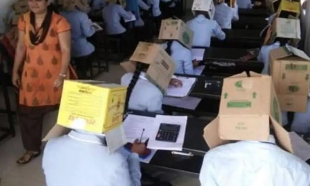 విద్యార్ధలపై ఓ యూనివర్సిటీ సిబ్బంది అతిగా ప్రవర్తించారు. విద్యార్ధులకు పరీక్ష హాలులో తల పక్కకు తిప్పకుండా, చూసి రాతలకు పాల్పడకుండా ఉండలని ఓ వినూత్న ఆలోచన చేసింది. విద్యార్థులందరి తలలకు అట్టపెట్టెలు పెట్టించింది.