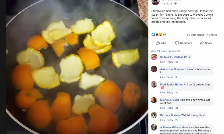 ఓ ఫేస్బుక్ యూజర్.. సముద్రపు నీటిలో ఆరెంజ్ తొక్కలు వేడి చేసే వీడియోను పోస్ట్ చేసి 15 నిమిషాలు ఆవిరి పీల్చాలని సూచించారు.. అందువల్ల కరోనా వైరస్ శరీరంలోకి రాకుండా నిరోధిస్తుందని నేను చేశాను మీరు కూడా చేయండని పోస్టులో పేర్కొన్నారు. దీంతో ఈ వీడియో వైరల్ అయింది.