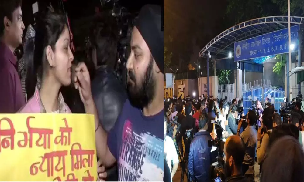 నిర్భయ దోషులను ఈ రోజు తెల్లవారుజామున 5.30 గంటలకు తీహార్ జైలులో ఉరి తీసిన సంగతి తెలిసిందే. దాంతో దేశవ్యాప్తంగా ప్రజలు సంబరాలు చేసుకున్నారు.ఆడకూతురిని వెంటాడి క్రూరాతి క్రూరంగా హింసించి చంపేసిన ఆ క్రూరమృగాళ్లను ఉరి తీయడం ద్వారా అటువంటి వారికి సరైన సందేశం ఇచ్చారని అభిప్రాయపడుతున్నారు. నలుగురు దోషులను ఉరి తీసే సమయంలో సాధారణ ప్రజలతో పాటు పెద్ద సంఖ్యలో మీడియా వ్యక్తులు కూడా తీహార్ జైలు వెలుపల వేచి ఉన్నారు. 'జడ్జిమెంట్ డే' పోస్టర్లతో అక్కడికి వచ్చిన ప్రజలు శుభవార్త కోసం ఎదురు చూస్తున్నారు. దీంతో తీహార్ జైలు వెలుపల పెద్ద సంఖ్యలో భద్రతా దళాలను కూడా మోహరించారు.