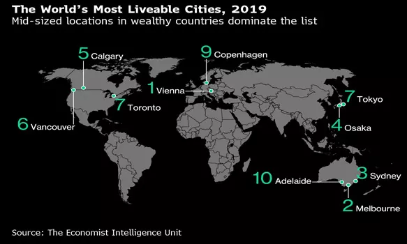 ఈ ఏడాది టాప్ నివాస యోగ్యమైన నగరంగా ఆస్ట్రియా దేశపు రాజధాని వియన్నా నిలిచింది. వియన్నా ఇలా మొదటి స్థానంలో నిలవడం వరుసగా ఇది రెండోసారి కావడం గమనార్హం. సిడ్నీ, ఒసాకా నగరాలు రెండు, మూడు స్థానాలను కైవసం చేసుకున్నాయి. అయితే, ఏడు సంవత్సరాల పాటు వరుసగా మొదటి స్థానంలో నిలిచినా మెల్బోర్న్ నగరాన్ని గత సంవత్సరం వియన్నా వెనక్కి నెట్టింది. ఇక ఈ జాబితాలోని తోలి 20 నగరాల్లో ఎనిమిది యూరప్ లోనే ఉండడడం చెప్పుకోదగ్గ అంశం. అయితే ఈసారి పారిస్ తన స్థానాన్ని బాగా దిగాజార్చుకుని 25 వ స్థానంలో నిలిచింది. ఇక లండన్, న్యూయార్క్ నగరాలు 48, 58 స్థానాలతో సరిపెట్టుకున్నాయి. ఇక సిరియా రాజధాని డమాస్కస్ ఈ లిస్టులో చిట్టచివరి స్థానాన్ని పొందింది. అదేవిధంగా పాకిస్తాన్ నగరాలు ధాకా, కరాచీ చివరి నుంచి రెండు స్థానాల్లో ఉన్నాయి.