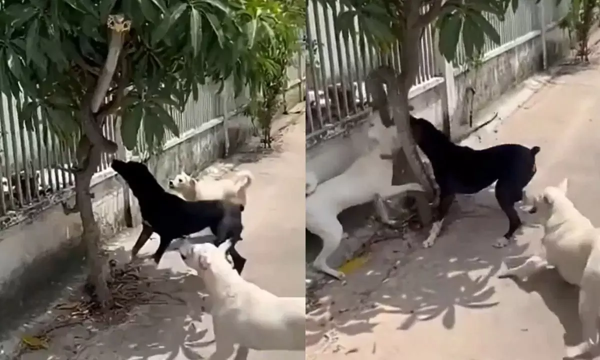 వైరల్ అవుతున్న ఈ వీడియోలో ఒక భారీ కింగ్ కోబ్రా చెట్టుపై పడగ విప్పి భీకరంగా కనిపిస్తుంది. దానిని చూడగానే మూడు కుక్కలు ఒక్కసారిగా రెచ్చిపోయాయి. సాధారణంగా పామును చూడగానే ఏ జంతువైనా భయపడుతుంది, కానీ ఈ కుక్కలు మాత్రం ఏమాత్రం వెనక్కి తగ్గలేదు. ఒక కుక్క ఏకంగా ఆ కోబ్రా తోక పట్టుకుని కిందకు లాగేయగా, మరో కుక్క నేరుగా దాని నోటిపైనే దాడికి దిగింది. ఈ దృశ్యం చూస్తున్నంత సేపు గుండె ఆగినంత పనవుతుంది. కేవలం 10 సెకన్ల నిడివి ఉన్న ఈ వీడియో నెటిజన్లను ఉక్కిరిబిక్కిరి చేస్తోంది.