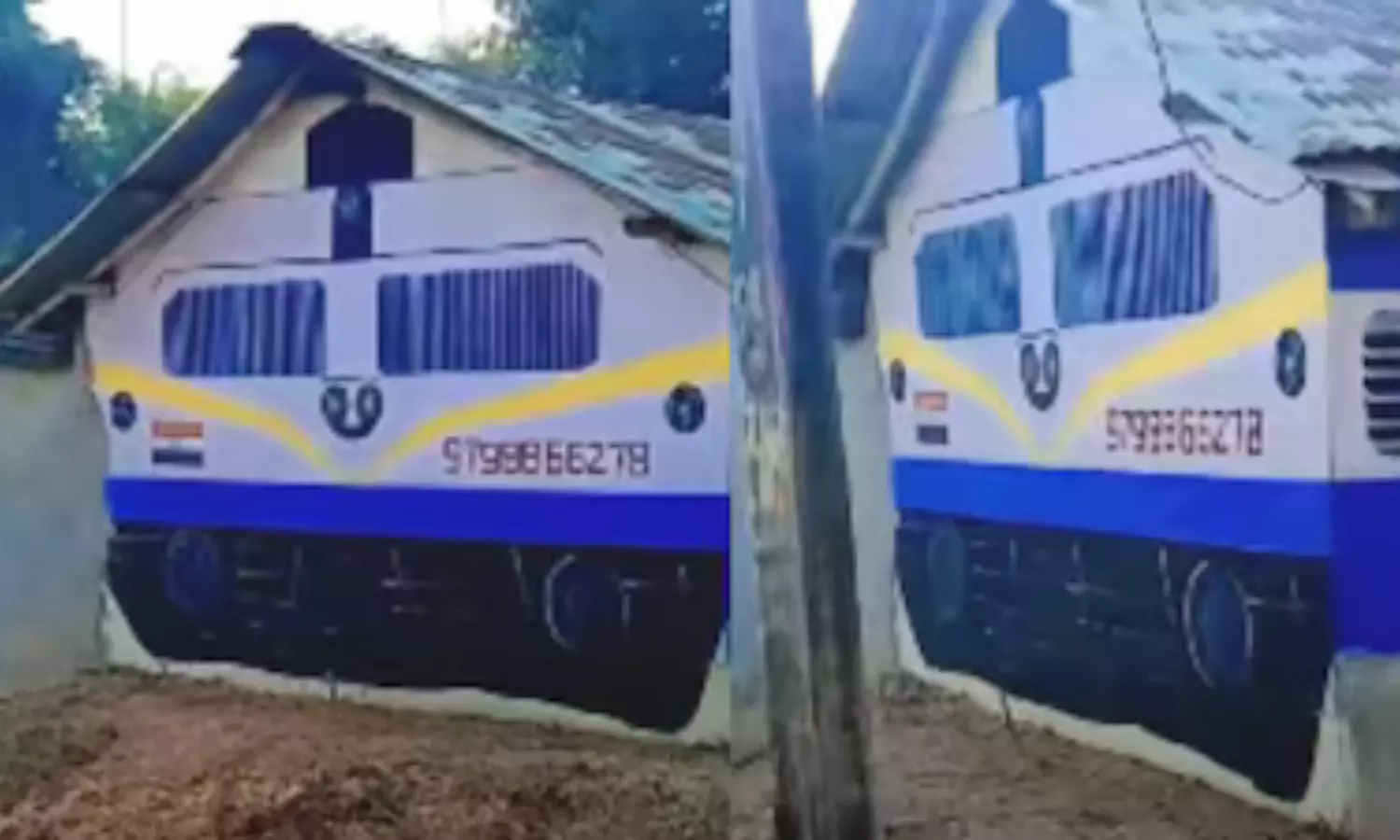 గ్రామంలో సాధారణంగా కనిపించే ఒక ఇంటి వద్దకు దగ్గరగా వెళ్లినప్పుడు, అది అచ్చం భారతీయ రైల్వే కోచ్ను తలపించేలా కనిపిస్తోంది. నీలం, తెలుపు, పసుపు రంగుల్లో ఇంటిని రంగవేసి, రైలు ఇంజిన్ ముందుభాగంలా డిజైన్ చేశారు. కింద భాగంలో చక్రాల్లా కనిపించేలా నలుపు రంగులో చిత్రాలు వేశారు. ఇంటి పైభాగంలో రైలు గుర్తింపు నంబర్లా ఒక సంఖ్యను కూడా చిత్రించారు.