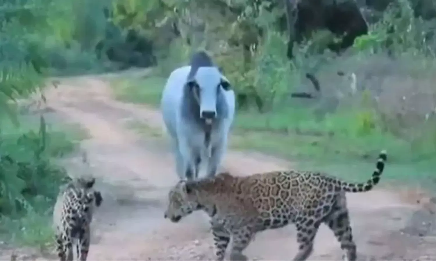 ఈ వీడియోలో అడవిలోని రోడ్డుమధ్య రెండు జాగ్వార్లు వేట కోసం ఎదురుచూస్తుంటాయి. కొద్ది సేపటికి ఆ దారిలో ఓ భారీ ఎద్దు ధైర్యంగా నడుస్తూ వస్తుంది. జాగ్వార్లను చూసినప్పటికీ, ఎద్దులో ఏమాత్రం భయం కనిపించదు. దీనికి భయపడాల్సిన జాగ్వార్లే ఎద్దు దగ్గరకి రాగానే భయంతో అక్కడి నుంచి తప్పించుకుంటాయి.