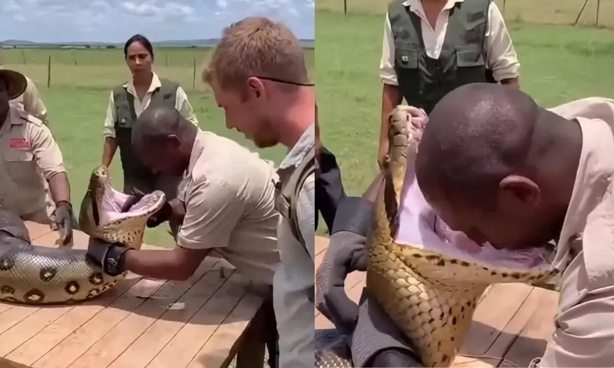 వైరల్ అవుతున్న ఈ వీడియోలో ఒక భారీ అనకొండ తన నోటిని పెద్దగా తెరిచి ఉండటం కనిపిస్తుంది. ఇంతలో ఒక వ్యక్తి ఏమాత్రం భయం లేకుండా తన తలను ఆ పాము నోటి లోపల పెట్టేందుకు ప్రయత్నించాడు. ఆ భారీ జీవి ఏమీ చేయదని అతను భావించాడు కానీ, మరుక్షణమే సీన్ రివర్స్ అయింది. అనకొండ ఒక్కసారిగా ఆగ్రహంతో ఊగిపోతూ ఆ వ్యక్తి తలను గట్టిగా పట్టేసుకుంది. అక్కడ ఉన్న ఇతర సిబ్బంది అతడిని విడిపించేందుకు శతవిధాలా ప్రయత్నించినా ఆ పాము పట్టు వదల్లేదు. ఈ దృశ్యం చూస్తుంటే ఒళ్లు గగుర్పాటుకు గురవుతుంది.