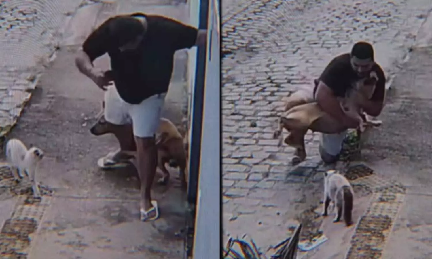 ఒక వ్యక్తి తన ఇంటి గేటు దగ్గర అలా నిలుచున్నాడు. అదే సమయంలో ఓ చిన్న పిల్లి అటుగా వచ్చింది. దీంతో గేటు లోపల ఉన్న పెద్ద కుక్క దానిపై దాడికి దిగేందుకు ప్రయత్నించింది. కానీ ఆ వ్యక్తి వెంటనే స్పందించాడు. ఆ కుక్క మీద దూకి దాన్ని అదిమేశాడు. దీంతో పిల్లి ఆ సమయంలో అక్కడ్నించి పారిపోయి ప్రాణాలు దక్కించుకుంది.