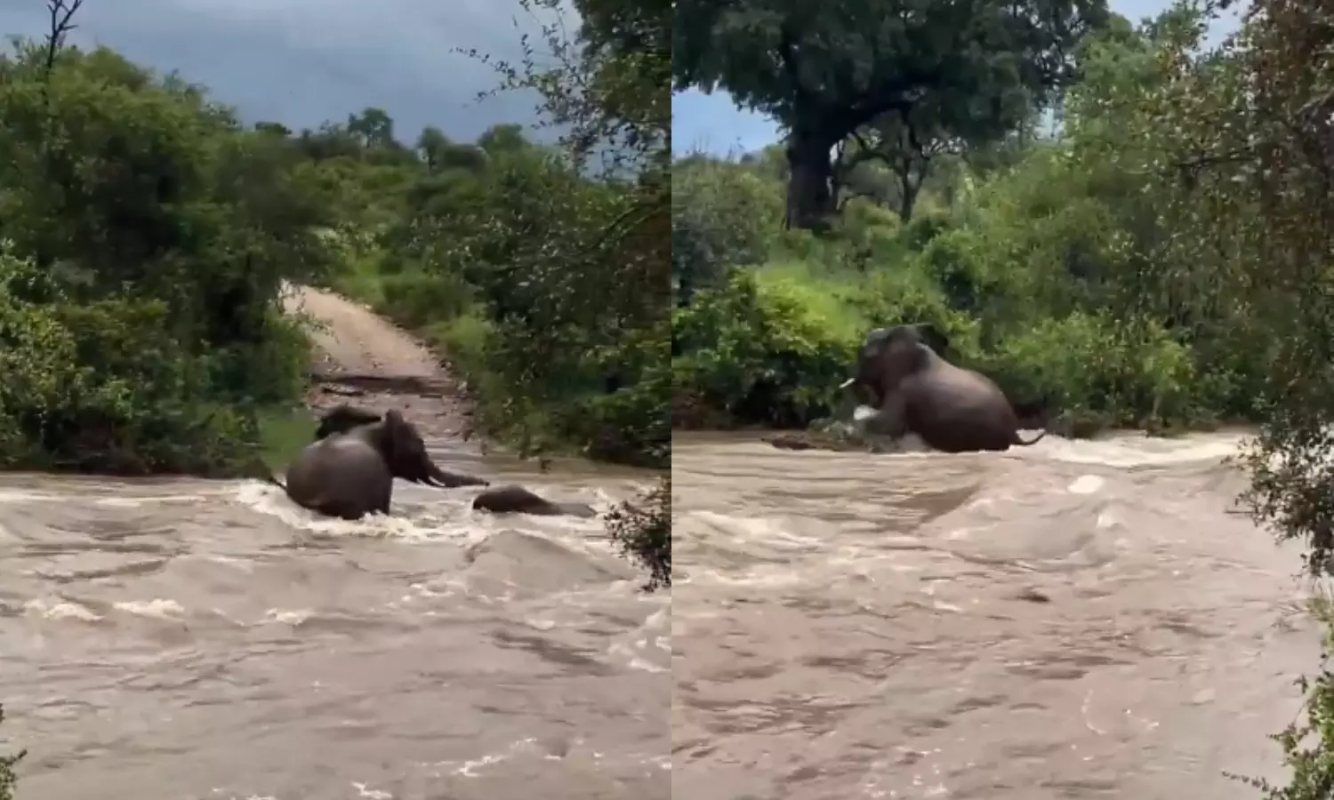 వివరాల ప్రకారం, ఈ ఘటన దక్షిణాఫ్రికాలోని ప్రముఖ క్రుగర్ నేషనల్ పార్క్లో చోటుచేసుకుంది. అక్కడ ఉగ్రరూపం దాల్చిన నది ప్రవాహాన్ని దాటే క్రమంలో ఒక ఆడ ఏనుగు, దాని పిల్ల నదిలోకి దిగాయి. తల్లి ఏనుగు తన శక్తితో ప్రవాహాన్ని ఎదుర్కొనగలిగినప్పటికీ, చిన్న పిల్ల ఏనుగు మాత్రం వేగంగా ప్రవహిస్తున్న నీటికి లోనై కొట్టుకుపోవడం ప్రారంభించింది.