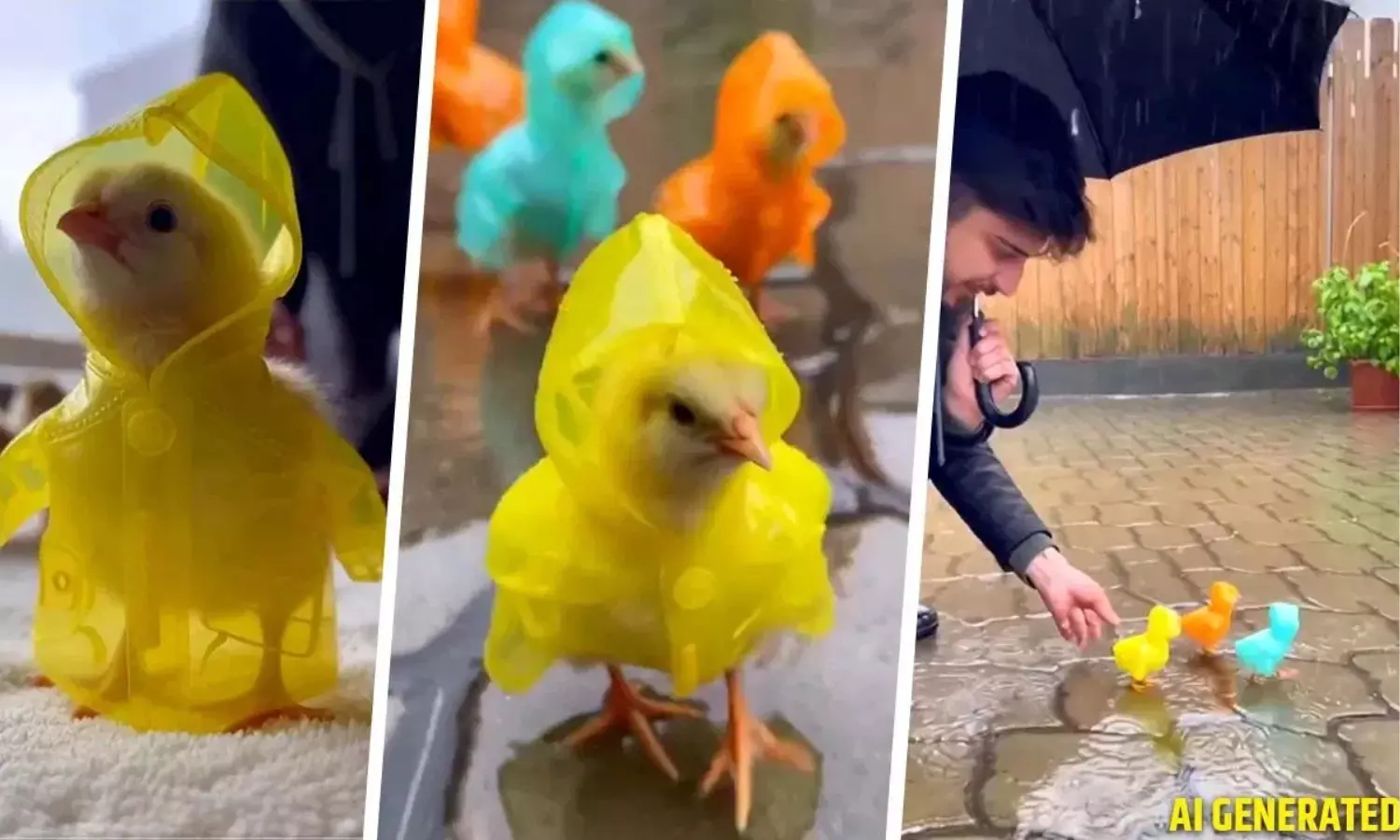 చిన్న కోడిపిల్లలకు రంగురంగుల రెయిన్ కోట్లు వేసిన వీడియో సోషల్ మీడియాలో వైరల్. AI సృష్టించిన క్లిప్ అయినప్పటికీ నెటిజన్లను ఆకట్టుకుంటోంది.