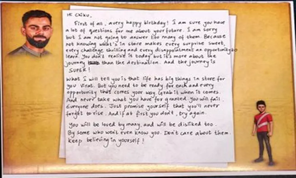 అయితే కోహ్లీ పుట్టిన రోజు సందర్భంగా సామాజిక మాధ్యమాల్లో ఓ భావోద్వేగ లేఖ వైరల్ అవుతోంది. విరాట్ కోహ్లీ(చీకు) ముద్దుపేరుతో సంబోధిస్తూ.. హయ్ చీకు నీకు పట్టిన రోజు శుభాకాంక్షలు. భవిష్యత్పై నీకు అపోహలు ఉన్నాయన్న సంగతి నాకు తెలుసు. నీ మదిలో అనేక ప్రశ్నలు ఉన్నాయని అనుకుంటున్నా వాటికి సమాధానాలు నేను చెప్పలేను, ఎప్పుడు ఏం జరుగుతుందో ఎవరికి తెలియదు. ప్రతీ అనుభుతిని ఆస్వాధించు, గమ్యం కంటే ప్రయాణం ముఖ్యమైందని గుర్తుంచుకో, ప్రతీ అవకాశాన్నిచేజారనీయకు ఉపయోగించుకో, ఓటమికి కంగిపోకు, గెలుపు కోసం ప్రయత్నం చేస్తూనే ఉండు, గెలిచే వరకు నిలబడు, అభిమానించే వాళ్లు, విమర్శించే వాళ్లు ఉంటారు.