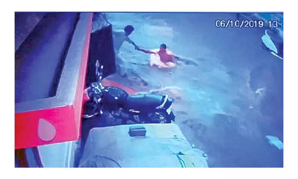 హైదరాబాద్ లో నిన్న కురిసిన వర్షానికి రోడ్లన్నీ వాగులని తలపించాయి. రోడ్లపై నీరు ఏరుల్లా పారింది. ఈ సమయంలో ఎక్కడి వాహనాలు అక్కడ ఆగిపోయి ట్రాఫిక్ నిలిచిపోయింది. ఇక ఎలిబీనగర్ ప్రాంతంలో నీళ్లు రోటీలను ముంచేయడంతో ప్రజలు తీవ్ర ఇబ్బందులు పడ్డారు. ఈ సమయంలో లింగోజి గూడ డివిజన్ కాకతీయ కాలనీ లోని ఏడో నెంబరు రోడ్డు నీట మునిగింది. సరిగ్గా అప్పుడే ఆరోడ్డున వెడుతున్న ఓ మహిళా(30 ) వర్షపు నీటిలో చిక్కుంది. ఆ నీటి ప్రవాహానికి ఆమె కొట్టుకు పోవడం మొదలైంది. అదే రోడ్డులో ఓ భవనం లో నివాసముంటున్న ప్రశాంత్ దీనిని గమనించారు. వెంటనే కిందకు దిగి వచ్చి ఆ మహిళకు చేయి అందించి ఆమెను సురక్షితంగా లాగడంతో ఆమెకు ప్రాణాపాయం తప్పింది. అక్కడి స్థానికులు అందరూ ప్రశాంత్ ను అభినందించారు.