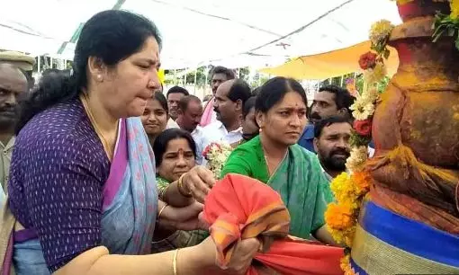 తెలంగాణ ప్రభుత్వం ప్రతిష్టాత్మకంగా నిర్వహిస్తున్న బతుకమ్మ చీరల పంపిణీ కొనసాగుతుంది. అందులో భాగంగా గిరిజన శిశు సంక్షేమ శాఖ మంత్రి సత్వవతి రాథోడ్ మేడారంలో సమ్మక్క-సారలమ్మ వారిని దర్శిచుకొని చీరలు సమర్పించారు. ఈ సందర్భంగా మంత్రి మాట్లాడుతూ.. మంత్రిగా తన తొలి పర్యటన గిరిజన ప్రాంతంలో జరపడం బతుకమ్మ పండగ చీరల పంపిణీతో కార్యక్రమానికి శ్రీకారం చుట్టడం ఆనందించదగ్గ విషయమన్నారు. గిరిజన తండాలో పుట్టి, పెరిగిన తనకు ముఖ్యమంత్రి మంత్రివర్గంలో స్థానం కల్పించడం బాధ్యత పెంచిందన్నారు. సీఎం తనపై ఉంచిన నమ్మకాన్ని నిలబెట్టాలనే కోరికతో మేడారం సమ్మక్క-సారలమ్మ ఆశీర్వాదం తీసుకొని, బతుకమ్మ తొలి చీరలను అమ్మవార్లకు సమర్పించానన్నారు. అనంతరం ఆమె ములుగులో చీరల పంపిణీ కార్యక్రమంలో పాల్గొననున్నారు.