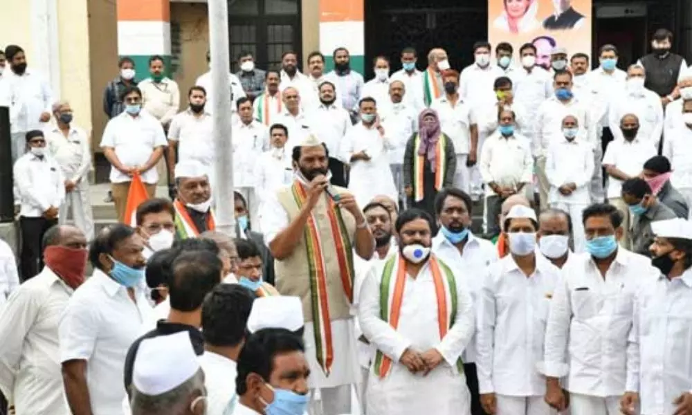 తెలంగాణ రాష్ట్ర అవతరణ దినోత్సవ వేడుకలు గాంధీభవన్లో ఘనంగా జరిగాయి. టీపీసీసీ అధ్యక్షుడు ఉత్తమ్ కుమార్రెడ్డి జాతీయ పతాకాన్ని ఆవిష్కరించారు. ఉత్తమ్తో పాటు కాంగ్రెస్ నేతలు వి.హనుమంతరావు, పొన్నం ప్రభాకర్, షబ్బీర్ అలీ తదితరులు పాల్గొన్నారు. ఈ సందర్బంగా ఉత్తమ్ మాట్లాడుతూ.. తెలంగాణ ప్రజల కల నెరవేర్చిన సోనియాకు ఉత్తమ్కుమార్రెడ్డి ధన్యవాదాలు తెలిపారు. స్వరాష్ట్రంలో అన్ని వర్గాల ప్రజలు కష్టాలు పడుతున్నారని అన్నారు. అన్యాయాలు జరిగాయన్న నేతలే నియంత పాలన సాగిస్తున్నారని ఆయన విమర్శించారు.