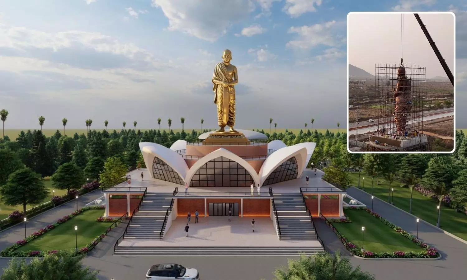 ఈ విగ్రహ ఏర్పాటు కోసం రాష్ట్ర ప్రభుత్వం శాఖమూరులో సుమారు 6.8 ఎకరాల సువిశాల స్థలాన్ని కేటాయించింది. ఈ ప్రాంగణాన్ని ఒక అందమైన స్మృతి వనంగా తీర్చిదిద్దారు. శంకుస్థాపన జరిగిన కేవలం ఆరు నెలల కాలంలోనే ఈ విగ్రహ నిర్మాణ పనులను యుద్ధ ప్రాతిపదికన పూర్తి చేయడం గమనార్హం. ఒక మహత్కార్యం కోసం ప్రభుత్వం, ట్రస్ట్ సభ్యులు ఎంత చిత్తశుద్ధితో పనిచేశారో చెప్పడానికి ఇది నిదర్శనం.