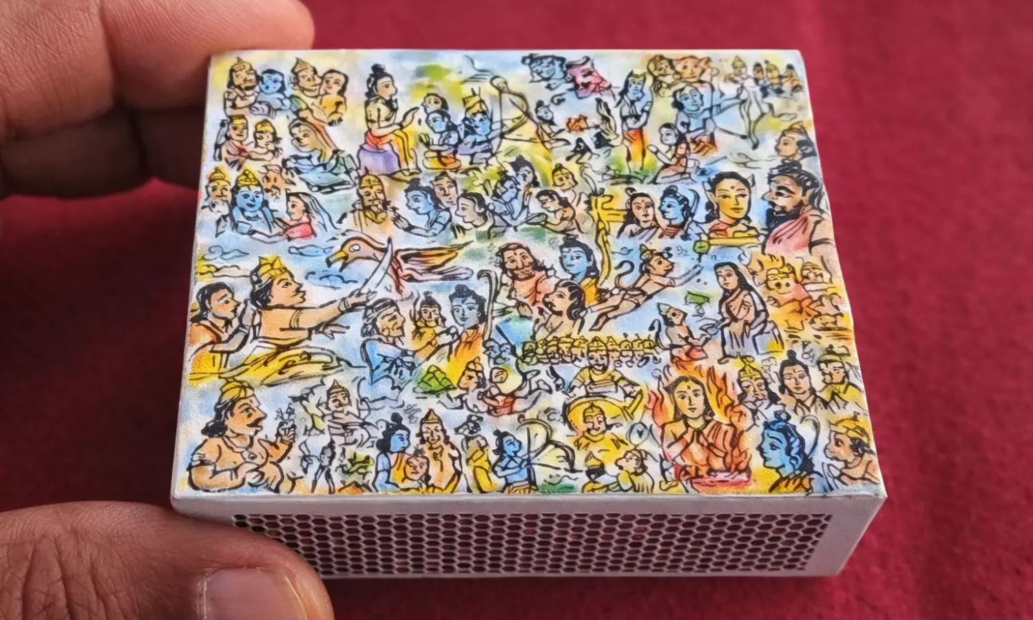 లంకా దహనం, కుంభకర్ణుడు, ఇంద్రజిత్తులతో యుద్ధం చేస్తున్న రామలక్ష్మణులు, యుద్ధంలో మూర్ఛ పోయిన లక్ష్మణుడు, సంజీవ పర్వతం తెస్తున్న హనుమాన్, రామ రావణ యుద్ధంలో రావణుడి సంహారం, అగ్ని పరీక్షలో మహా సాద్వి సీతమ్మ వున్నట్లు ఇలా ఇన్ని ప్రధాన ఘట్టాలను చిన్న అగ్గిపెట్టె పై వేసాను. శ్రీరాముని మీద వున్నా భక్తితో ఈ చిత్రం వేసానన్నారు.