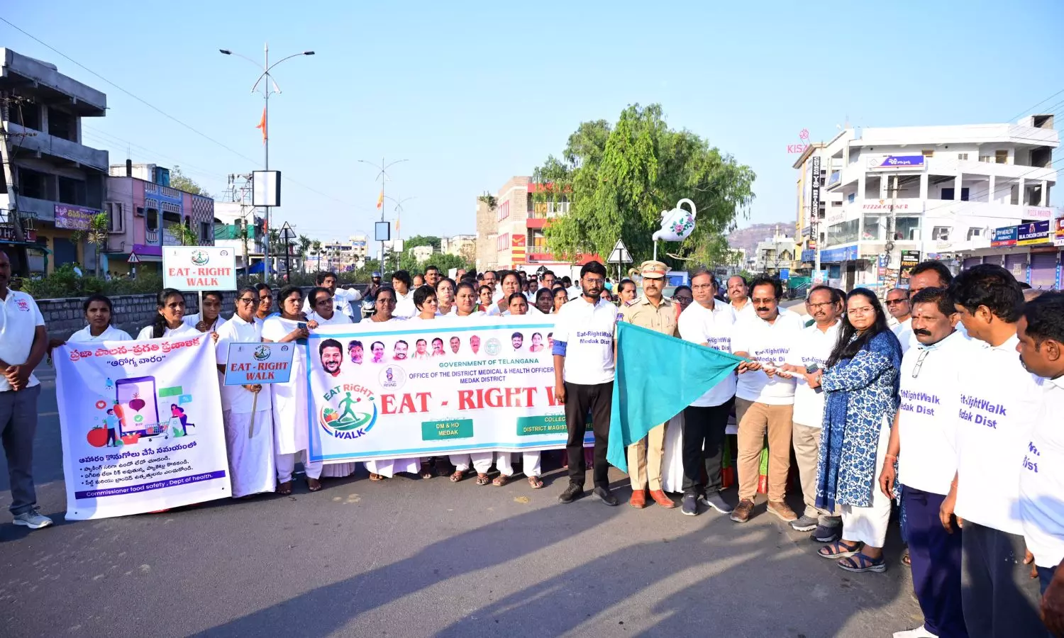 మెదక్: 99 రోజుల ప్రజా పాలన - ప్రగతి ప్రణాళిక కార్యక్రమంలో భాగంగా ఆరోగ్య శాఖ ఆధ్వర్యంలో సోమవారం ఆహార భద్రతపై ప్రత్యేక దినోత్సవం సందర్భంగా జిల్లా కేంద్రంలోని అంబేద్కర్ చౌరస్తా ఈట్ రైట్ - వాక్ కార్యక్రమాన్ని నిర్వహించగా, జిల్లా కలెక్టర్ ప్రతిమా సింగ్ ఈ ర్యాలీని జెండా ఊపి ప్రారంభించారు.