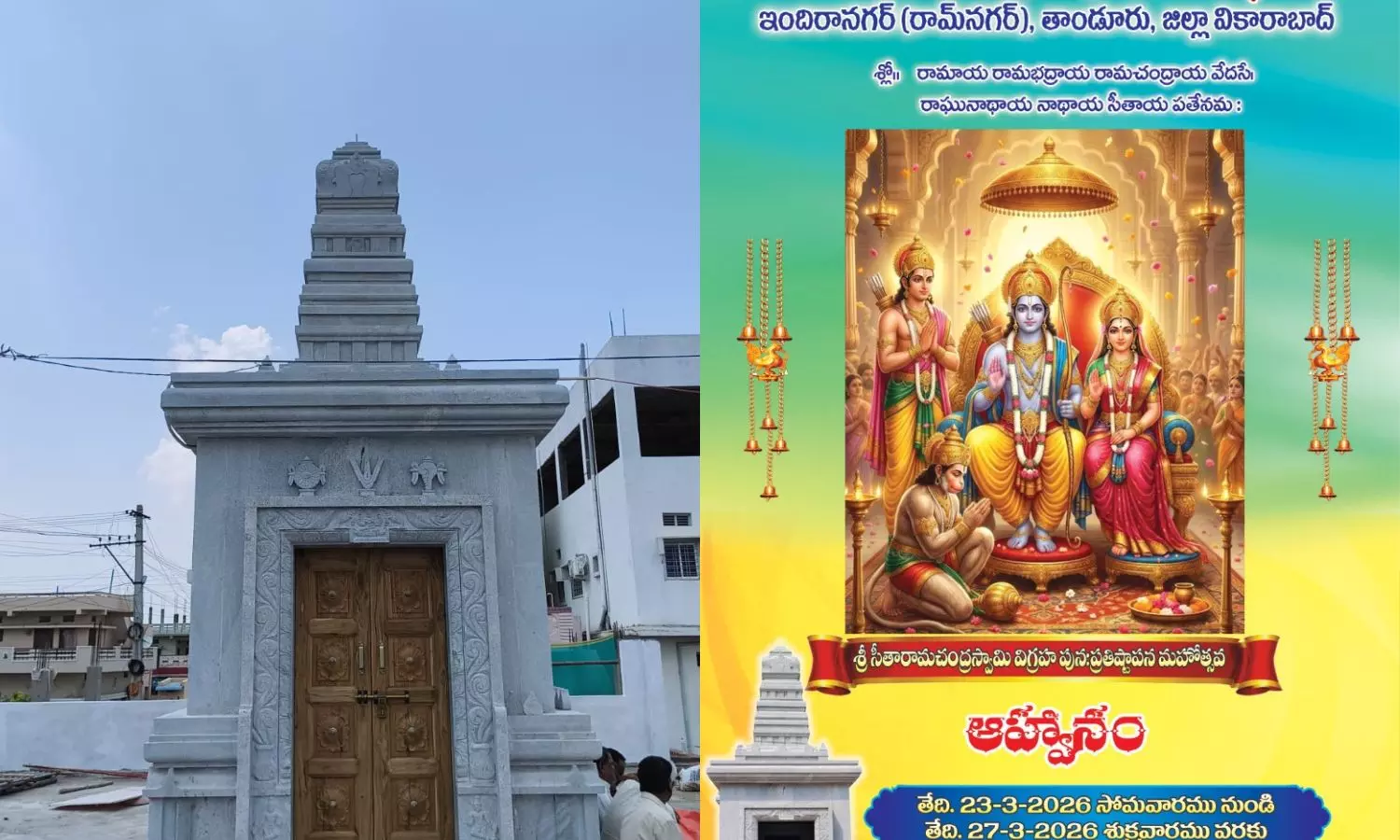 తాండూరు (వికారాబాద్ జిల్లా): తాండూరు పట్టణంలోని ఇందిరానగర్లో నూతనంగా పునర్నిర్మించిన రామాలయం పునః ప్రారంభోత్సవానికి సర్వం సిద్ధమైంది. భక్తుల సహాయ సహకారాలతో అత్యంత సుందరంగా తీర్చిదిద్దిన ఈ ఆలయంలో, ఈ నెల 23వ తేదీ నుండి ఐదు రోజుల పాటు విగ్రహ ప్రతిష్ఠాపన మహోత్సవాలు అత్యంత వైభవంగా జరగనున్నాయి.