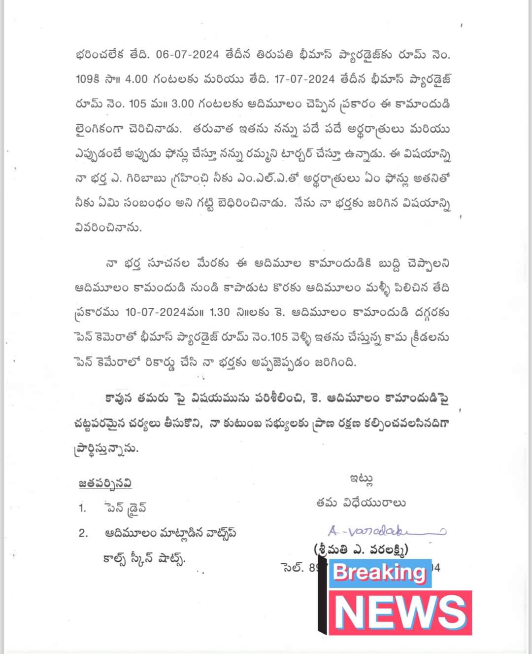 తనకు జరిగిన అన్యాయంపై న్యాయం చేయాలని కోరుతూ ఏపీ సీఎం చంద్రబాబు, టీడీపీ జాతీయ ప్రధాన కార్యదర్శి లోకేష్ కు ఫిర్యాదు చేసినట్టుగా ఆమె చెప్పారు. ఈ విషయమై సత్యవేడు ఎమ్మెల్యే ఆదిమూలం వివరణ కోసం ప్రయత్నిస్తే ఆయన ఫోన్ కు అందుబాటులోకి రాలేదు. ఈ ఆరోపణలను తెలుగుదేశం పార్టీ సీరియస్ గా తీసుకుందని సమాచారం. మీడియాలో వస్తున్న కథనాల ఆధారంగా ఎమ్మెల్యే ఆ పార్టీ చర్యలు తీసుకొనే అవకాశం ఉందని సమాచారం.