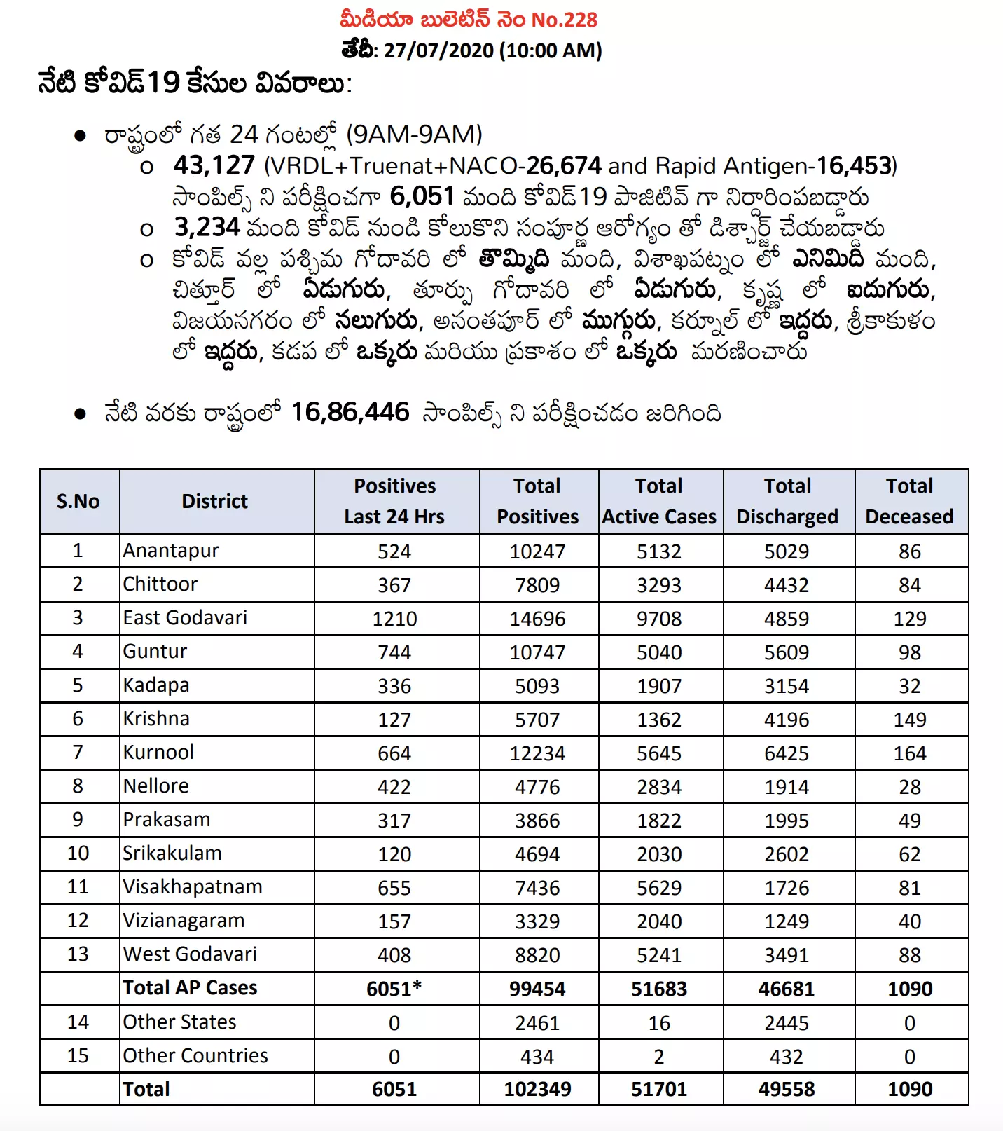 రాష్ట్రంలో నమోదైన మొత్తం కేసులు 1,02,349. ఇప్పటి వరకు కరోనా వైరస్ కారణంగా మృతి చెందిన వారి సంఖ్య 1,090. ఇప్పటి వరకు వివిధ ఆసుపత్రుల్లో చికిత్స పొంది కోలుకుని డిశ్చార్జి అయిన వారి సంఖ్య 49,558 కి చేరింది. ప్రస్తుతం వివిధ కొవిడ్ ఆసుపత్రుల్లో 51,701 మంది చికిత్స పొందుతున్నారు. ఆంధ్రప్రదేశ్లో గడిచిన 24 గంటల్లో రాష్ట్రవ్యాప్తంగా 43,127 కరోనా శాంపిల్స్ పరీక్షించారు. ఇప్పటి వరకు ఏపీలో 16,86446 కరోనా శాంపిల్స్ నిర్వహించింది ప్రభుత్వం.