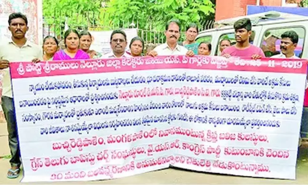 తమను అన్యాయంగా వేధిస్తున్నారని.. ఆత్మహత్యకు అనుమతి ఇవ్వాలని కోరుతూ.. నెల్లూరు జిల్లా బుచ్చిరెడ్డిపాలంకు చెందిన ఓ కుటుంబం కలెక్టరేట్ వద్ద ఆందోళనకు దిగింది. నెల్లూరు జిల్లాలోని సంగం గ్రామంలో తమకు భూమి ఉందని, పక్కనే ఉన్న పొలం యజమాని తమ కోసం ఆస్తిని విక్రయించాలని ఒత్తిడి తెస్తున్నారని కుటుంబ యజమాని వసంతయ్య తెలిపారు. అయితే తాము విక్రయించేందుకు సిద్ధంగా లేమని చెబితే అతను తమపై బెదిరింపులకు దిగుతున్నాడని.. వసంతయ్య స్థానిక పోలీసుకు ఫిర్యాదు చేశాడు.