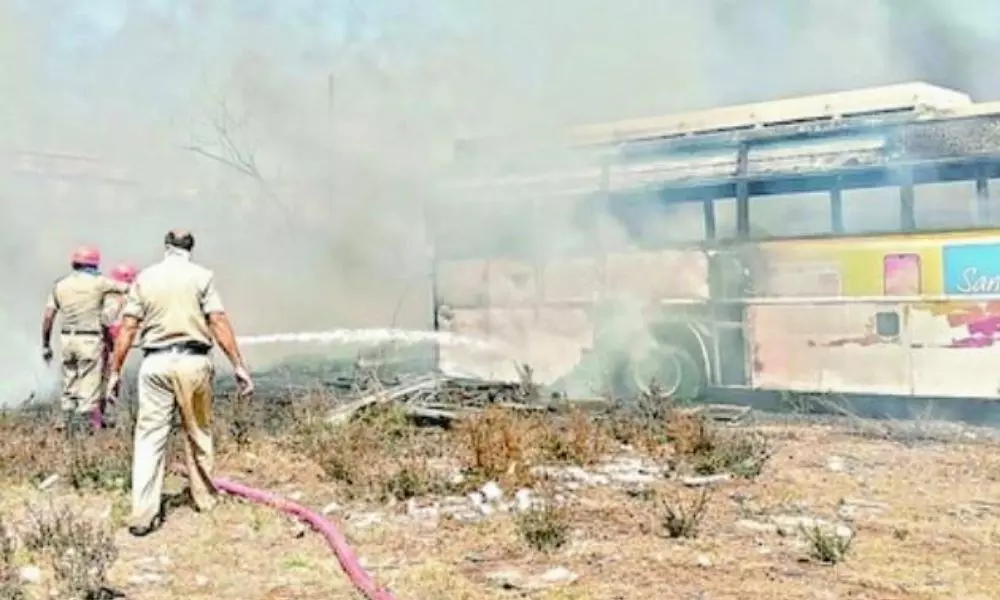 దీనిని ఎవరూ గమనించకపోవడంతో మంటలు నెమ్మదిగా వ్యాపించడం మొదలుపెట్టాయి. మధ్యాహ్నం కావడంతో గాలి తోడైంది. దీంతో ఒక్కసారి మంటలు అంటుకున్నాయి. బస్సులకు సంబంధించిన విడిభాగాలు, టైర్లు అంటుకోవడంతో మంటలు వ్యాపించాయి. అక్కడే ఉన్న మూడు స్క్రాప్ బస్సులకు కూడా మంటలు వ్యాపించడంతో భారీ ఎత్తున ఎగసిపడ్డాయి. దట్టమైన పొగలు వ్యాపించాయి. స్థానికంగా ఉన్న వారు పొగలు, మంటలను చూసి భయాందోళన చెంది, ఘటన స్థలానికి చేరుకున్నారు. దాదాపు రెండు గంటల పాటు చుట్టూ పక్కల ప్రాంతాలను పొగ కమ్ముకుంది. అగ్నిమాపకశాఖకు ఫోన్ చేయడంతో వారు హుటాహుటిన ఘటన స్థలానికి చేరుకున్నారు. దాదాపు నాలుగు గంటల పాటు 13 నీటి ట్యాంకర్లతో మంటలను అదుపు చేశారు.