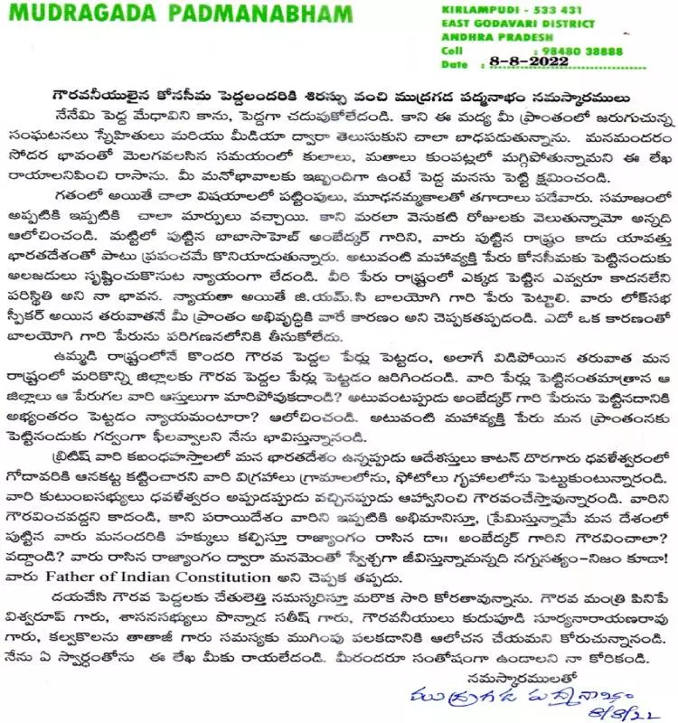 Mudragada Padmanabham: కోనసీమ జిల్లా పేరు మార్పు వివాదంపై కాపు ఉద్యమ నేత ముద్రగడ పద్మనాభం స్పందించారు. కోనసీమ పెద్దలకు ఓ లేఖ రాశారు. మన మట్టిలో పుట్టిన బాబాసాహెబ్ అంబేద్కర్ను, యావత్తు భారతదేశంతో పాటు ప్రపంచమే కొనియాడుతుందన్నారు. అటువంటి మహావ్యక్తి పేరు కోనసీమకు పెట్టినందుకు అలజడులు సృష్టించడం న్యాయంగా లేదన్నారు. వీరి పేరు రాష్ట్రంలో ఎక్కడ పెట్టిన ఎవ్వరూ కాదనలేని పరిస్థితి అని, తన భావనను ముద్రగడ పద్మనాభం వ్యక్తం చేశారు. నిజానికి కోనసీమకు జి.యమ్.సి బాలయోగి పేరు పెట్టాలి. ఆయన లోక్సభ స్పీకర్ అయిన తరువాతనే మీ ప్రాంతం అభివృద్ధికి కారణమని చెప్పక తప్పదు. అయితే ప్రభుత్వం ఏదొక ఒక కారణంతో బాలయోగి పేరును పరిగణనలోనికి తీసుకోలేదన్నారు ముద్రగడ.