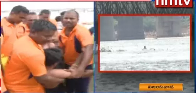 పట్టపగలు ఓ వ్యక్తి ప్రకాశం బ్యారేజ్ పై నుంచి కృష్ణా నదిలో దూకారు. నదిలో కొట్టుకుపోతూ కాపాడండి అంటూ అర్తనాదాలు చేశారు. సమాచారం అందుకున్న ఎన్డీఆర్ ఎఫ్ సిబ్బంది బాధితుడిని కాపాడారు. ఇంటి ఓనర్ వేధింపులు తాళలేక కృష్ణానదిలో దూకాను అని బాధితుడ చెబుతున్నాడు. దుర్గమ్మ తల్లి దయతో ప్రాణాలతో బయటపడ్డానని తెలిపారు.