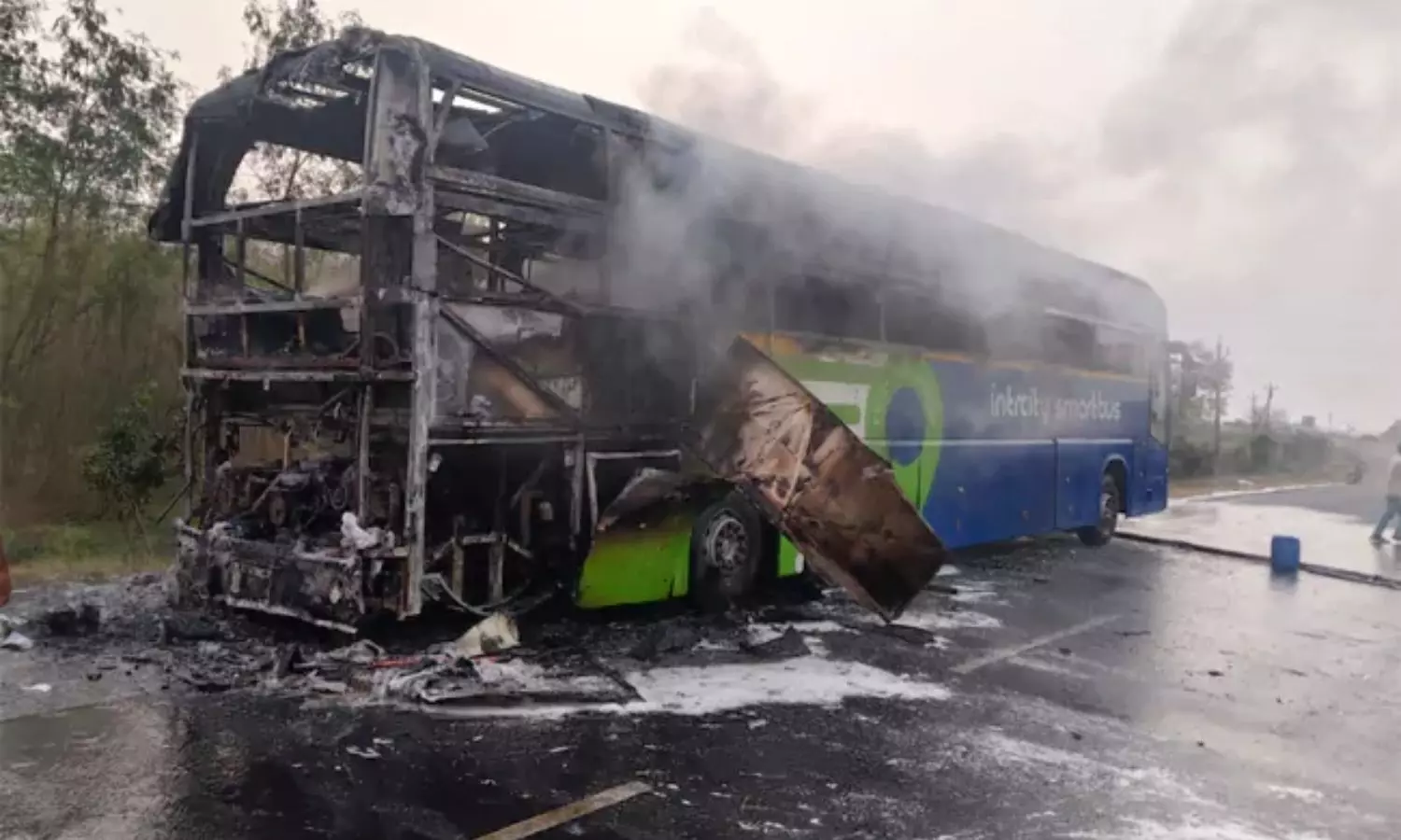 ఎన్టీఆర్ జిల్లాలో జాతీయరహదారిపై ప్రైవేట్ ట్రావెల్స్ బస్సు దగ్ధం