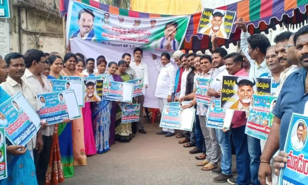 రాజమహేంద్రవరం: ఆంధ్రప్రదేశ్ రాష్ట్ర అభివృద్ధి వికేంద్రీకరణకు మూడు రాజధానులు మద్దతుగా స్థానిక ఆల్కట్ గార్డెన్ అయిదు బళ్ల మార్కెట్ నందు వైస్సార్...