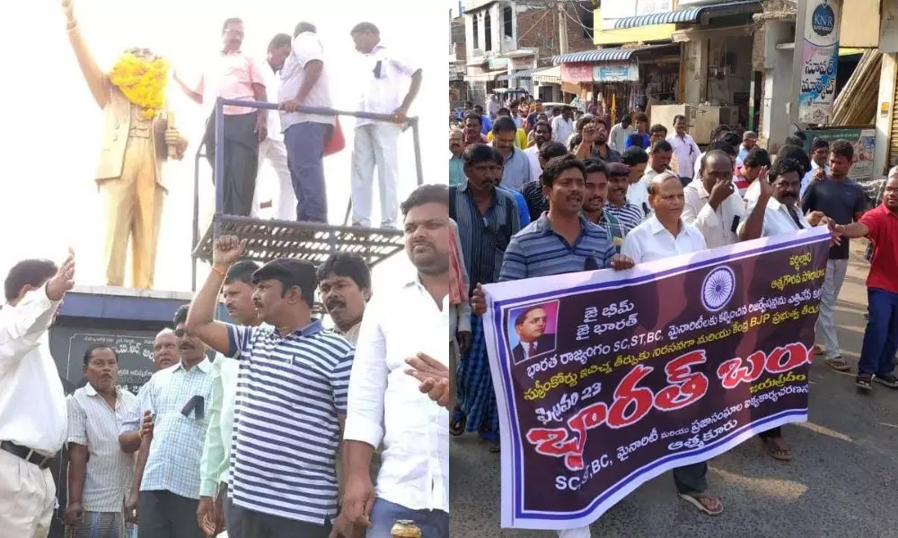 ఆత్మకూరు: రిజర్వేషన్ పై సుప్రీంకోర్టు నిర్ణయాన్ని నిరశిస్తూ రిజర్వేషన్లు కొనసాగించాలని, దేశవ్యాప్తంగా జరుగుతున్న బంద్ లో భాగంగా ఎస్టీ, ఎస్సీ, బిసి, మైనార్టీ నాయకులు ప్రజా సంఘాలు ఉపాధ్యాయ సంఘాలు ఆధ్వర్యంలో నెల్లూరు జిల్లా ఆత్మకూరు పట్టణంలో ర్యాలీ రాస్తారోకో చేపట్టారు. రాజ్యాంగం కల్పించిన రిజర్వేషన్ల పక్రియను సవరించేలా సుప్రీం కోర్టు నిర్ణయాన్ని పునరాలోచించాలని, రిజర్వేషన్ యథావిధిగా కొనసాగించే విధంగా చర్యలు తీసుకోవాల్సిన ఆవశ్యకత ఎంతో వుందని.
