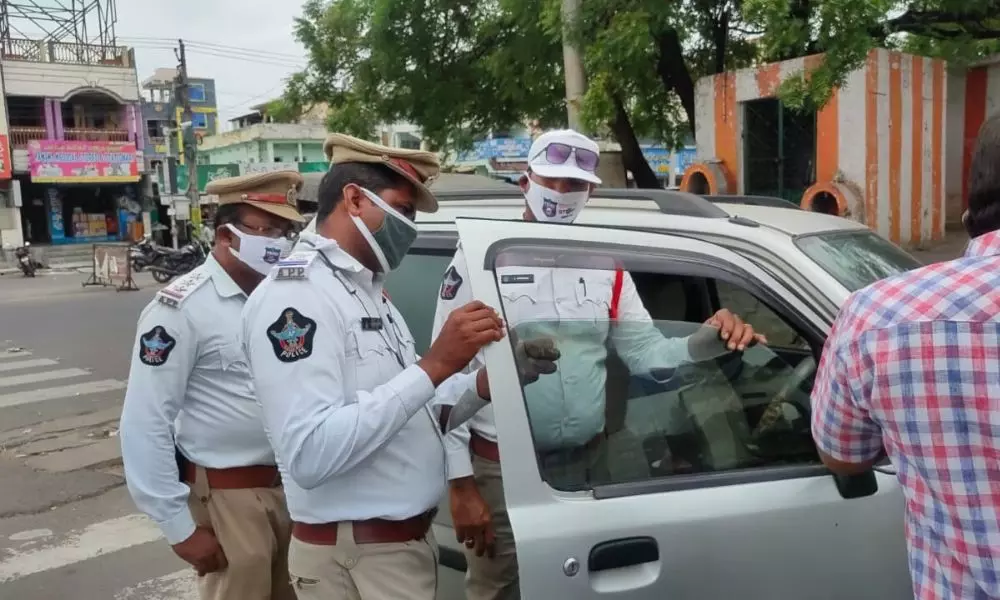 విజయవాడ: కరోనా పై అవగాహన కల్పించేందుకు 3వ ట్రాఫిక్ సీఐ బాలరాజు ఆదేశాల మేరకు పోలీసు సిబ్బంది వాహనచోదకులకు మాస్కుల పై అవగాహన కల్పించారు.మాస్కుల యెక్క ఆవశ్యకత ను ప్రతి ఒక వాహనచోదకులకు తెలియజేయడానికి విజయవాడ సిటీ పోలీస్ లోగో కలిగిన ఫేస్ మాస్క్ ను ధరించి మాస్క్ ఎంత ఉపయోగకరమో వివరించారు. కరోనా ను ప్రాలదోలాలంటే మాస్క్ ను తప్పనిసరిగా ఉపయోగించాలని బయటకు వచ్చేటప్పుడు ఎట్టి పరిస్థితుల్లో మాస్క్ తీయకూడదని తగు సూచనలు జారీచేశారు.