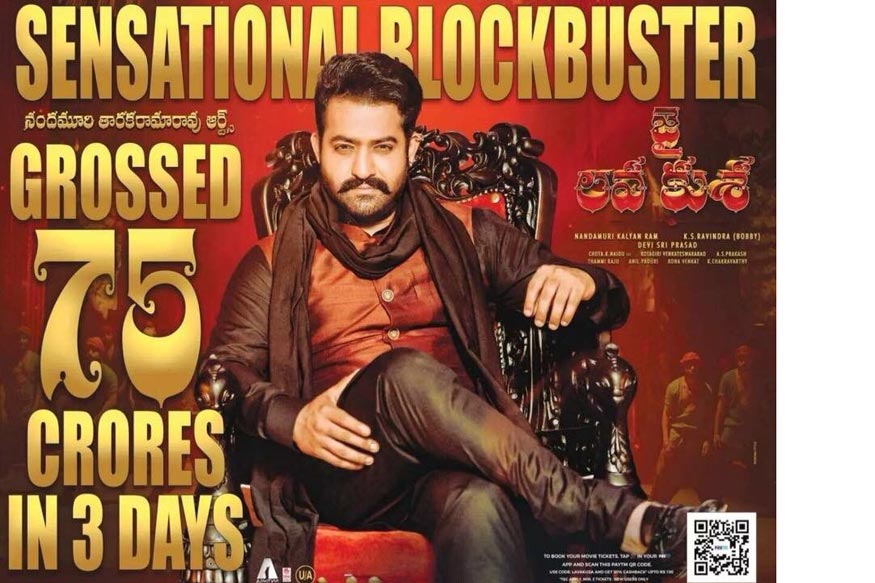 యంగ్టైగర్ ఎన్టీఆర్ తాజా చిత్రం 'జై లవకుశ'.. టాక్తో సంబంధం లేకుండా బాక్సాఫీస్ వద్ద వసూళ్లతో దూసుకుపోతోంది. మూడు రోజులకి గానూ ఈ సినిమా రూ.75 కోట్ల గ్రాస్ని సొంతం చేసుకుంది. ఇవాళ కూడా కలెక్షన్లు స్టడీగానే ఉన్నాయని ట్రేడ్ వర్గాలు చెబుతున్నాయి. ఆదివారం లేదా సోమవారంతో ఈ సినిమా రూ.100 కోట్ల గ్రాస్ని సొంతం చేసుకునే అవకాశం ఉందని వారు చెబుతున్నారు.