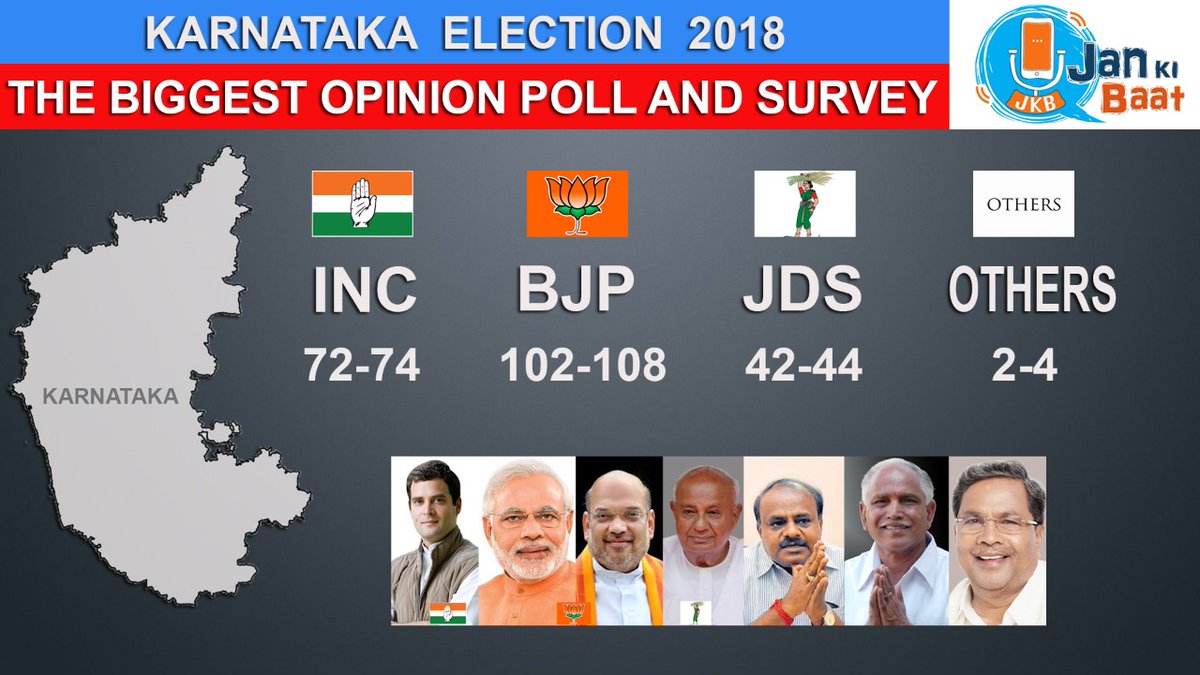 కర్నాటక అసెంబ్లీ ఎన్నికల్లో బీజేపీ మేజిక్ ఫిగర్కు సమీపంలో నిలుస్తుందని జన్ కీ బాత్ ఒపీనియన్ పోల్ సర్వే చెబుతోంది. జన్ కీ బాత్ సర్వేలోను బీజేపీకి 102 నుంచి 108 సీట్లు వస్తాయని తెలిపింది. మే 3వ తేదీ వరకు 1,20వేల మంది నుంచి జన్ కీ బాత్ అభిప్రాయ సేకరణ చేసింది. ఈ సర్వేలో బీజేపీ బాగా పుంజుకుందని, కాంగ్రెస్, జేడీఎస్ పార్టీలు చతికిలపడతాయని వెల్లడించింది. ఈ సర్వే ప్రకారం కాంగ్రెస్ పార్టీకి 72-74 స్థానాలు, జేడీఎస్కు 42-44 స్థానాలు వస్తాయి. ఇతరులకు రెండు స్థానాలు వస్తాయి. మే 3 తర్వాత ప్రచారానికి మరో వారం గడువు ఉండటటంతో ఓటర్లలో కమలానికి మద్దతు పెరిగే అవకాశముందని తెలిపింది.