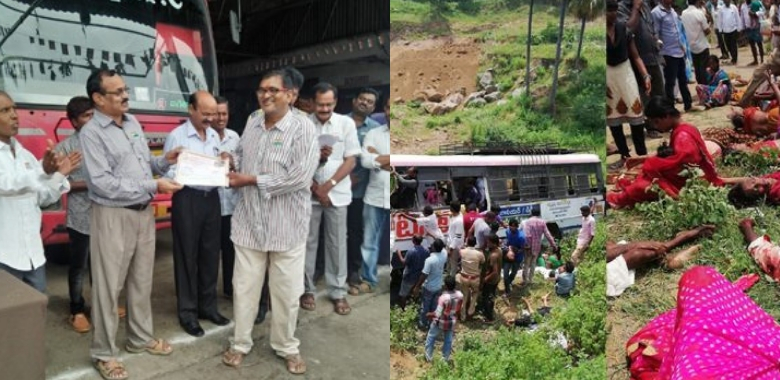 కొండగట్టు బస్సు ప్రమాదానికి కారకుడిగా చెబుతున్న డ్రైవర్ శ్రీనివాస్ను ఆర్టీసీ యాజమాన్యం ఉత్తమ డ్రైవర్ అవార్డుతో సత్కరించింది. కొండగట్టు ఘాట్లో ఘోర ప్రమాదానికి డ్రైవర్ శ్రీనివాస్ నిర్లక్ష్యమే కారణమన్న ప్రచారం జరుగుతున్న ఈ సమయంలో ఉత్తమ అవార్డు గ్రహీత ఇంతటి ప్రమాదానికి ఎలా కారకుడయ్యాడన్న అనుమానాలు వ్యక్తమవుతున్నాయి.